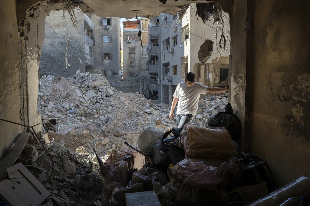 Lebanon 2024 br ANATOMY OF A STRIKE br br A friend of Mohammad descends the staircase of the Fawaz building carrying a few belongings salvaged from the rubble br
