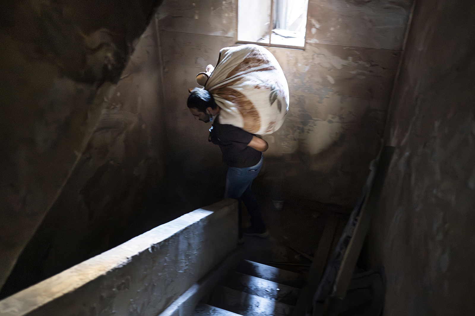 Lebanon 2024 br ANATOMY OF A STRIKE br br A friend of Mohammad descends the staircase of the Fawaz building carrying a few belongings salvaged from the rubble br