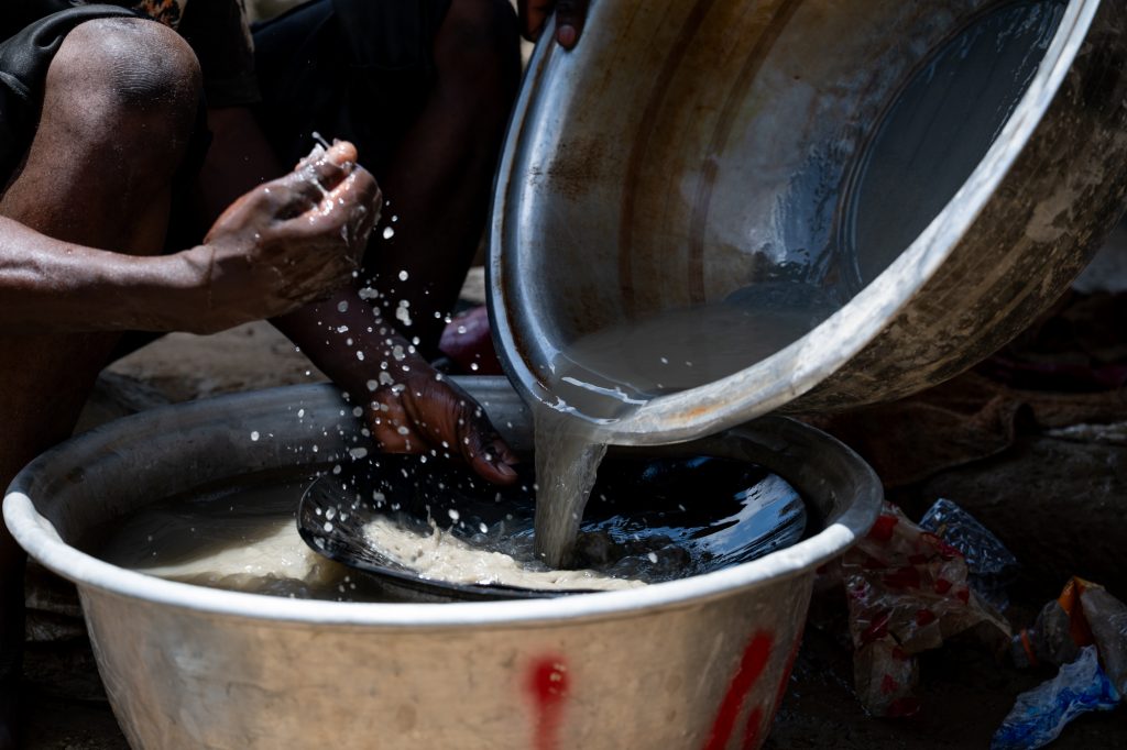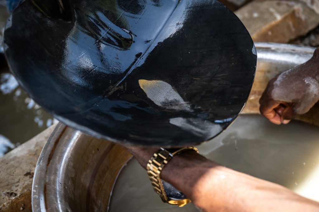 A galamsey miner washes silt to separate out tiny flecks of gold part of the arduous process of small-scale mining in Ghana