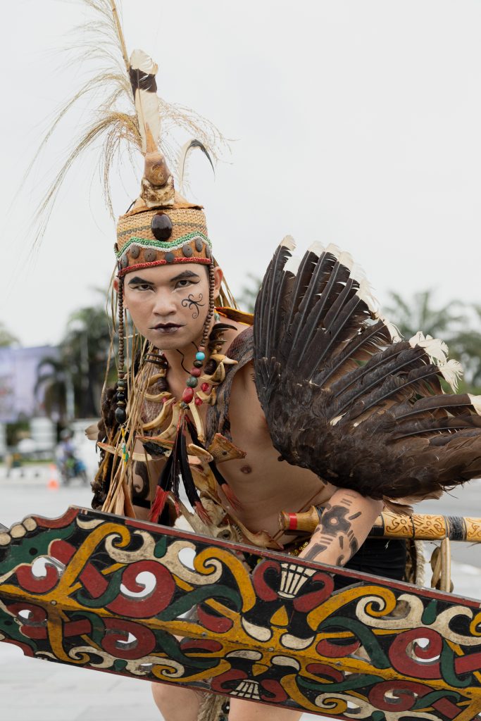 Traditional attire of Dayak warrior with shield feathers and hornbill beak Beyond physical defense Dayak shields are believed to provide spiritual protection from enemy spirits curses and unsee danger While feathers represent spiritual armor status and cosmic connectors reflecting both the warrior s courage and the community s beliefs about harmony with nature and the spirit world The beak signify bravery leadership and high rank in the community br br Indra 37 y o notary native Dayak br br Palangka Raya Central Kalimantan Indonesia