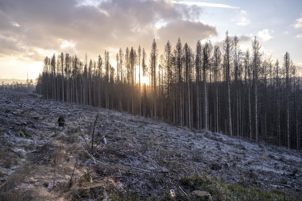 Two people walk through a clearing in Gummersbach Germany on January 18 2023 with a few spruce trees of a former plantation left on the horizon I learned that many of the forests of my childhood had been wood plantations The landscape changed so drastically that I started to get lost in the forest as the trees and ways of orientation were missing