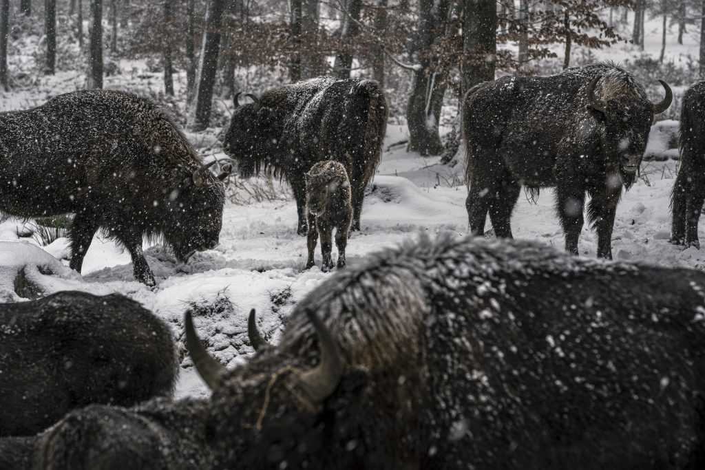 Wild European bisons the Wisent in the Roothaar-Mountain in Germany on January 7 2022 They are the only wild roaming herd in Western Europe and have grown into a population of 40 - a renaturation success story at first But a few months after this photo the forester responsible for the project suddenly passed away and no successor could be found - the son of the lord who had funded the project showed no interest in proceeding The project started to face many problems mostly of small forest farmers accusing the project of the roaming herd and destruction of their trees For a long while reparations had been paid but with no successor there was no money left and the Wisent-Welt had to declare insolvency The future of the project remains unclear