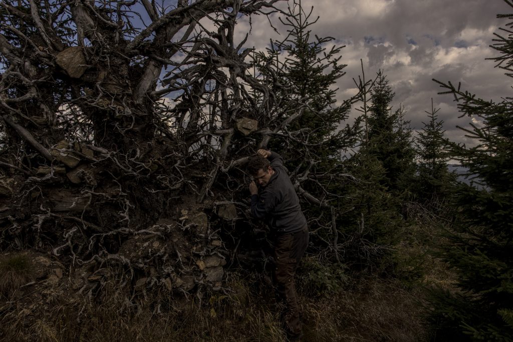 Forest scientist Martin Scholz climbs down the roots of a spruce tree that fell during a storm in the Bavarian National Park in Neusch nau Germany on September 9 2022 The spruce trees are native in the region the fallen trunk shows how shallow and broad the roots are - made for higher-lying rocky areas with a lot of humidity The Bavarian Forest National Park covers about 242 square kilometers in the eastern part of Bavaria Germany and is an exemplary model for conservation and biodiversity preservation Committed to natural processes the park doesn t intervene - deadwood decays naturally enabling the regeneration of the forest despite of natural catastrophes like storms and bark beetle infections The park has withstood critics along the years of its creation in 1970 and is home to rare species like the Eurasian lynx Seeing with my own eyes how nature regenerates itself and with what enormous amount of creativity if we just let it has been one of the major learnings of this project and brought me hope for the future