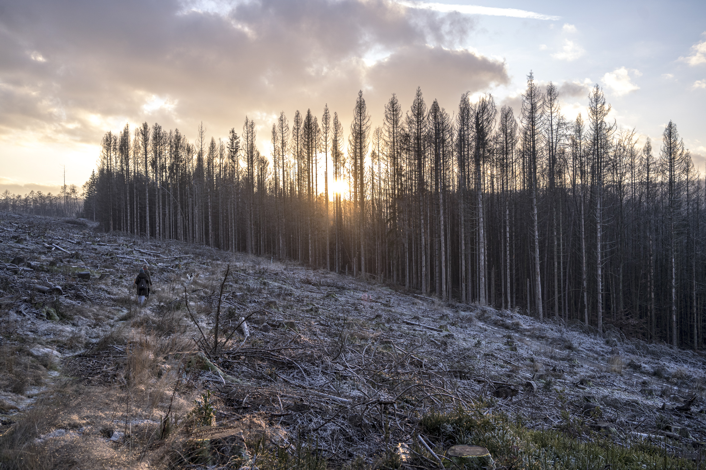 Two people walk through a clearing in Gummersbach Germany on January 18 2023 with a few spruce trees of a former plantation left on the horizon I learned that many of the forests of my childhood had been wood plantations The landscape changed so drastically that I started to get lost in the forest as the trees and ways of orientation were missing