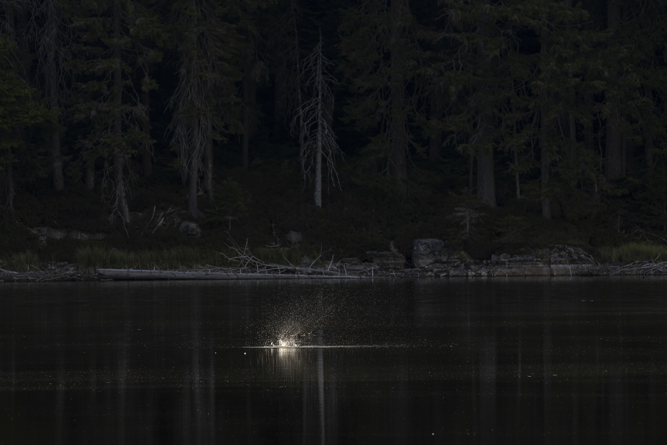 A goldeneye bathes in the afternoon light in the Rachelsee a lake in the Bavarian Forest National Park in Neusch nau Germany on September 9 2022 The goldeneye duck has become rare- its sudden appearance was like a quiet reminder of resilience in a changing landscape