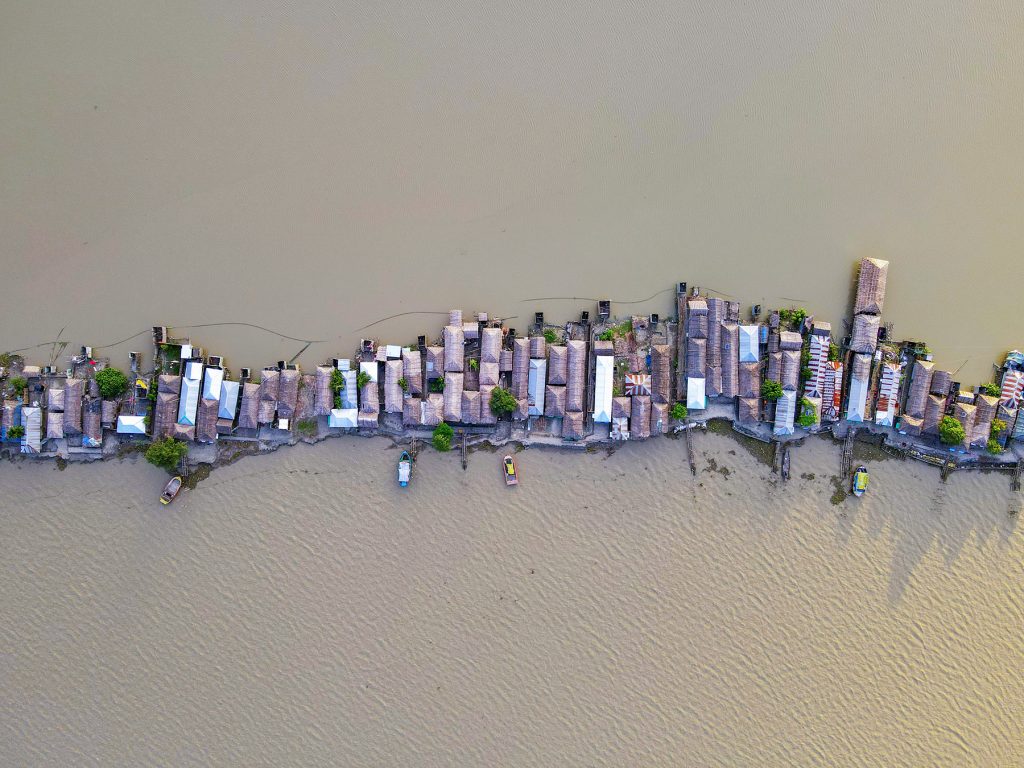An aerial view of Banishanta brothel built on an eroding riverbank in southern Bangladesh homes and lives surviving on the edge of climate collapse
