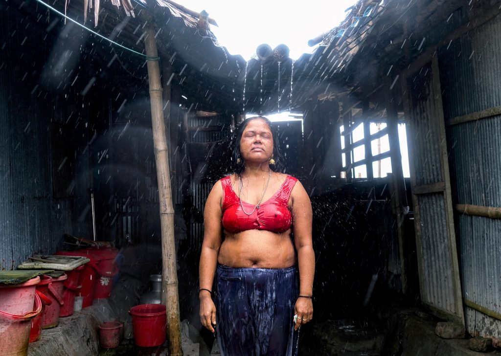 Nodi a sex worker in Banishanta brothel stands beneath the leaking roof during monsoon rain her body drenched yet her eyes closed in a rare moment of stillness For her and others here the rain is both a cleansing touch and a constant threat echoing the fragile lives along eroding shores Shoreline Secret of Baniashanta portrays women s resilience where survival becomes testimony to both climate injustice and human neglect