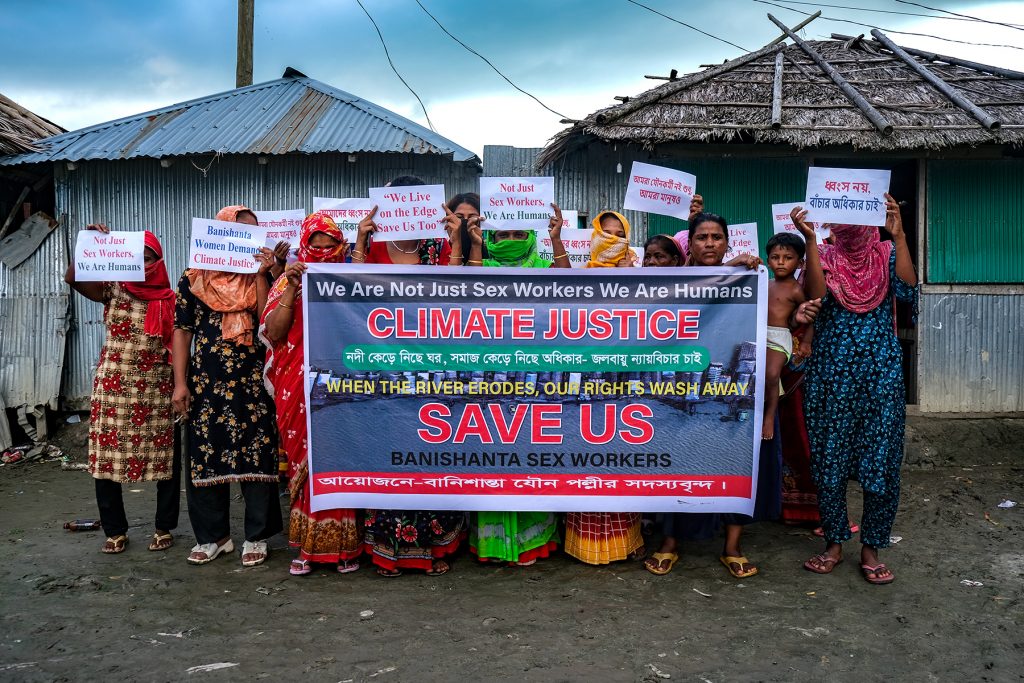 Banishanta sex workers hold banners demanding climate justice declaring We are not just sex workers we are humans Their brothel built on a fragile shoreline is being eaten away by river erosion while society continues to strip them of rights and dignity Shoreline Secret of Baniashanta documents this double struggle against the climate crisis and social exclusion where women at the edge of survival demand to be seen and heard