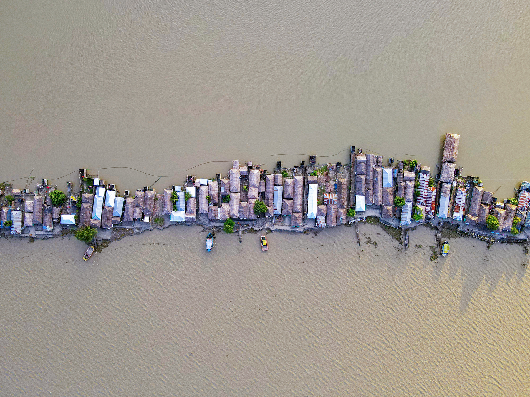 An aerial view of Banishanta brothel built on an eroding riverbank in southern Bangladesh homes and lives surviving on the edge of climate collapse