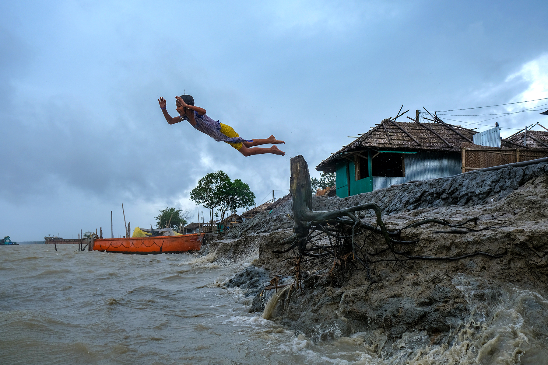 A little girl daughter of a sex worker in Banishanta jumps into the river beside her fragile home where erosion slowly devours the shoreline Her play unfolds against a backdrop of uncertainty between collapsing land and a community marked by stigma Shoreline Secret of Baniashanta reflects how innocence persists amid climate crisis and social exclusion where even children inherit the weight of survival on a vanishing edge