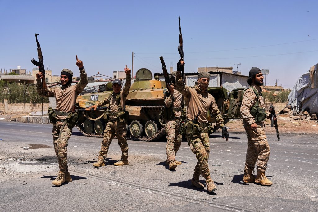 Members of Syrian security forces celebrate together after Syrian troops entered the predominantly Druze city of Sweida