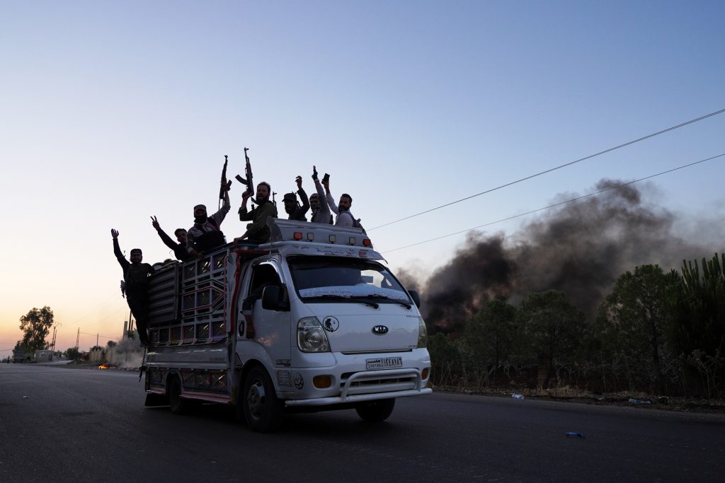 Smoke rises while Syrian security forces sit in the back of a truck as Syrian troops enter the predominantly Druze city of Sweida