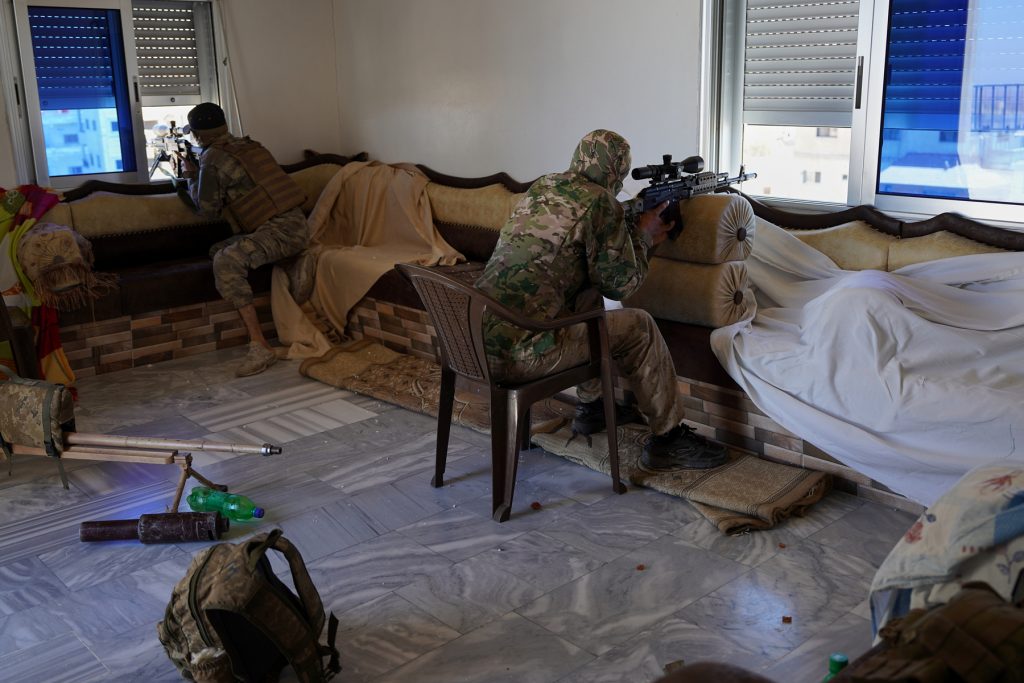 Members of Syrian security forces take position inside a house after clashes between Syrian government troops and local Druze fighters