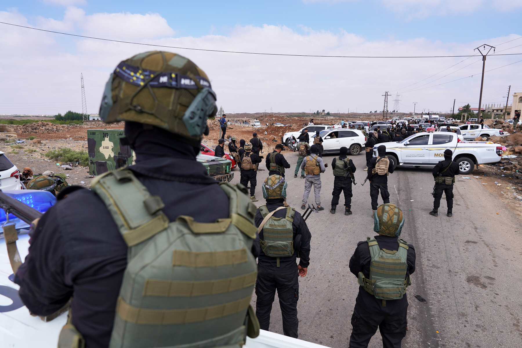 Members of the Internal Security Forces stand guard at an Internal Security Forces checkpoint working to prevent Bedouin fighters from advancing towards Sweida