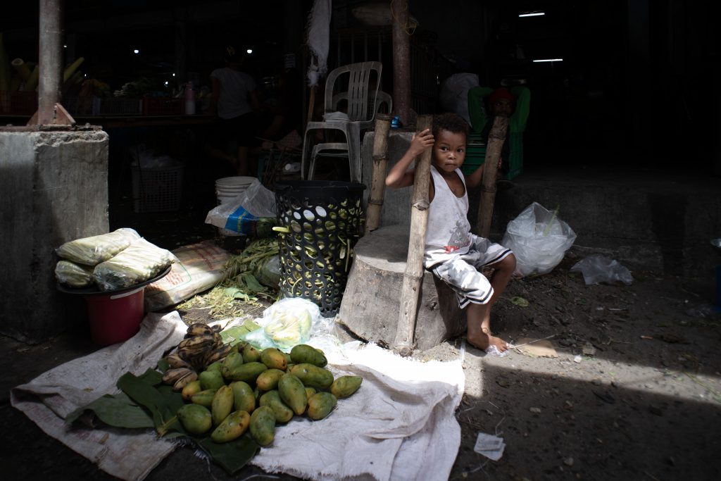 A child accompanies his father to sell mangoes at the Subic market NGOs support the community with education and child protection programs ensuring there is no child or forced labor