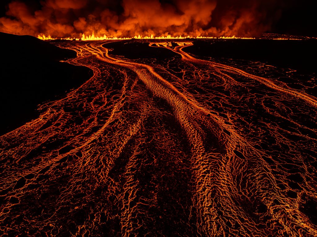 Reykjanes November 21 2024 - Along the Sundhn kag gar crater row the seventh episode of the Svartsengi cycle begins with a 4-km fissure tearing open the surface driving a fast-moving lava river roughly 2 5 km from the source br In its first hours discharge was estimated near 1 500 m s repeating the sequence seen throughout this eruption a sudden high-effusion burst that settles into weeks of steadier output br The flow front advances across fresh still-cooling fields laid down earlier in the year while the fissure glows in the background br This frame documents the characteristic powerful beginning of these eruptive episodes that has defined the series since December 2023 and continues to reshape the Reykjanes peninsula