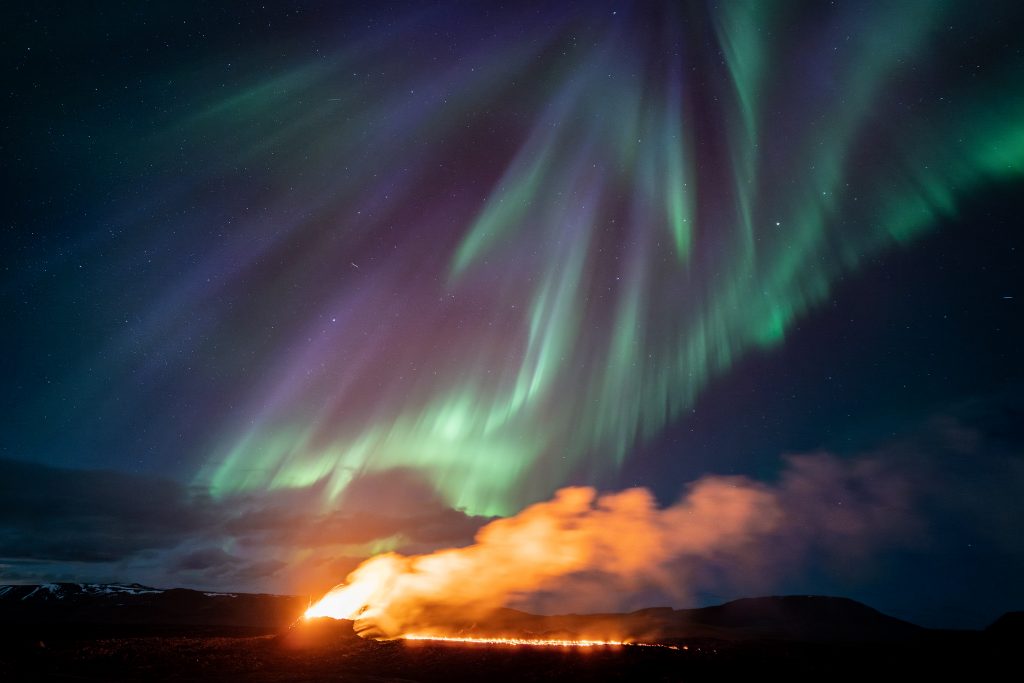 April 16 2024 - Northern lights dance above the active Sundhn kag gar crater row during the fourth episode of the Svartsengi eruption br Fountains and glowing channels light the lava field while aurora curtains fade in and out during one of the last clear nights before Arctic summer ends the season br The scene brings two untamed forces together geomagnetic light from the sky and volcanic light from the ground Even as these eruptions disrupt roads and daily life moments like this reveal a stark unmatched beauty that is uniquely Iceland