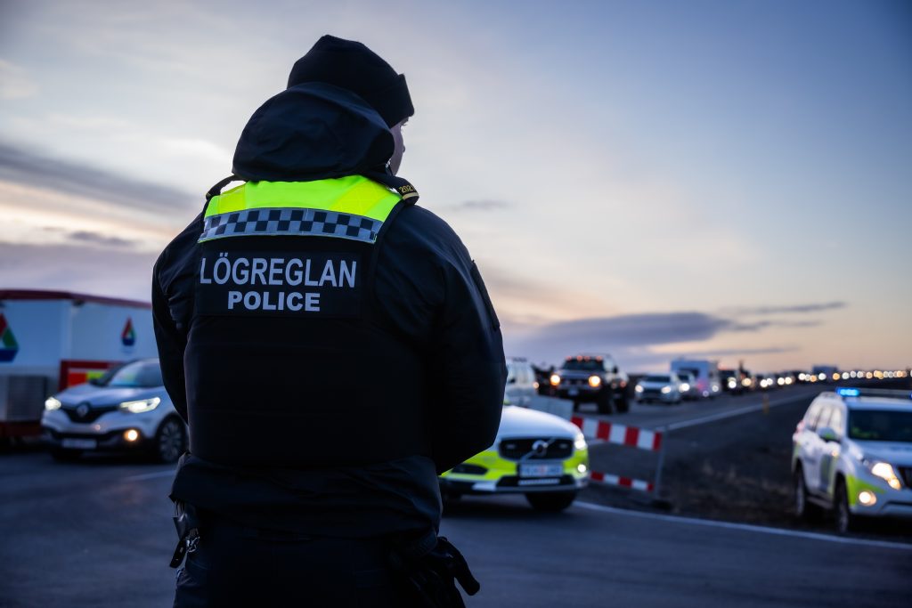 Su urstrandarvegur November 13 2023 - A police officer watches as a line of cars leaves Grindav k toward the checkpoint 12 km east br After the initial evacuation on November 10 residents were allowed brief controlled returns to collect essentials br The operations were conducted dividing the areas based on the damages observed in order to scatter the population and not to engulf the town unnecessarily Nightly curfews cleared the town again until morning br On higher-risk days access was cancelled altogether The rolling operation stretched on for weeks balancing urgency safety and the need to let people retrieve pieces of their lives