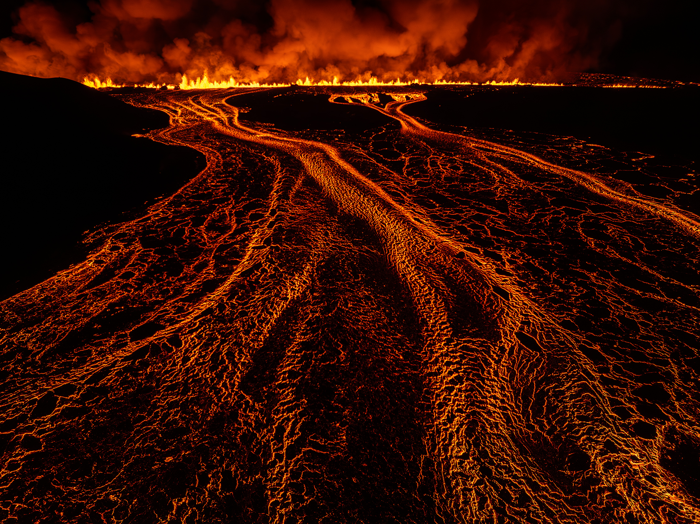 Reykjanes November 21 2024 - Along the Sundhn kag gar crater row the seventh episode of the Svartsengi cycle begins with a 4-km fissure tearing open the surface driving a fast-moving lava river roughly 2 5 km from the source br In its first hours discharge was estimated near 1 500 m s repeating the sequence seen throughout this eruption a sudden high-effusion burst that settles into weeks of steadier output br The flow front advances across fresh still-cooling fields laid down earlier in the year while the fissure glows in the background br This frame documents the characteristic powerful beginning of these eruptive episodes that has defined the series since December 2023 and continues to reshape the Reykjanes peninsula