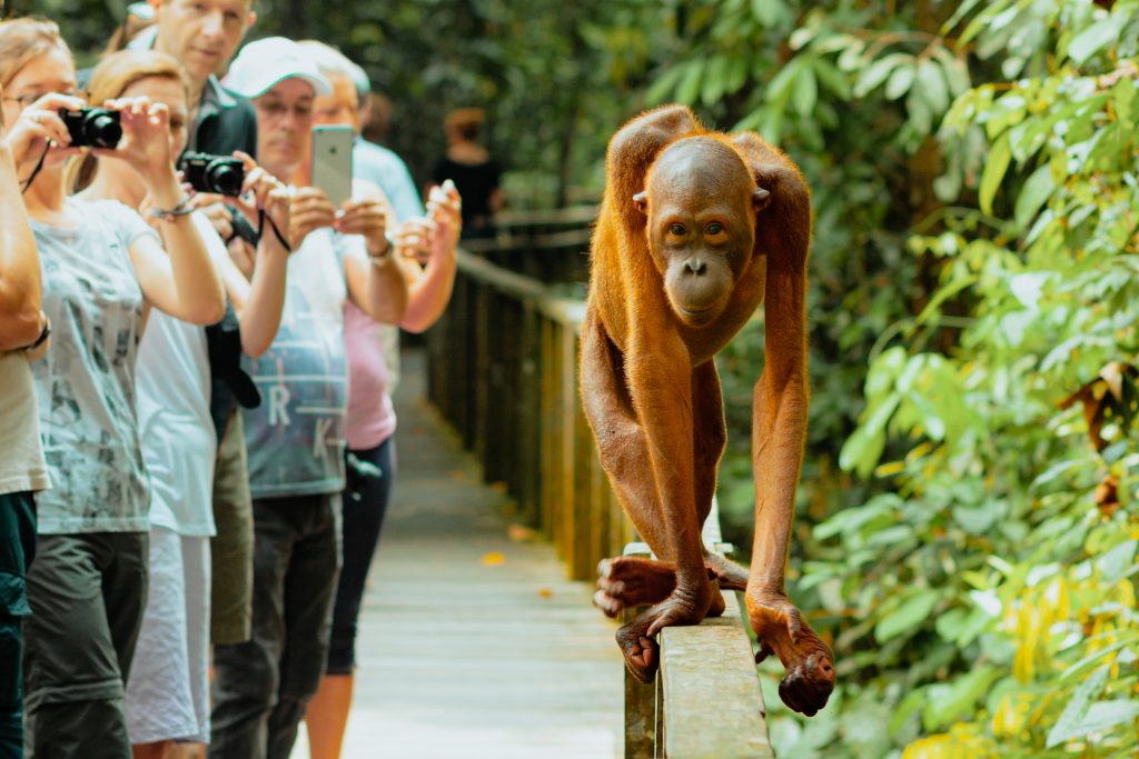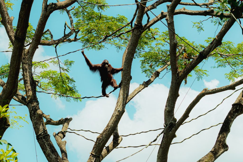 An orangutan moves freely across a tree draped with artificial lianas inside the Singapore Zoo A young ranger responsible for the orangutan section explains the animals origins and shares facts with visitors When asked if he has ever been to the Bornean rainforest he admits he has not I m quite busy and don t have time for travelling mainly busy working and hustling br br Singapore Zoo