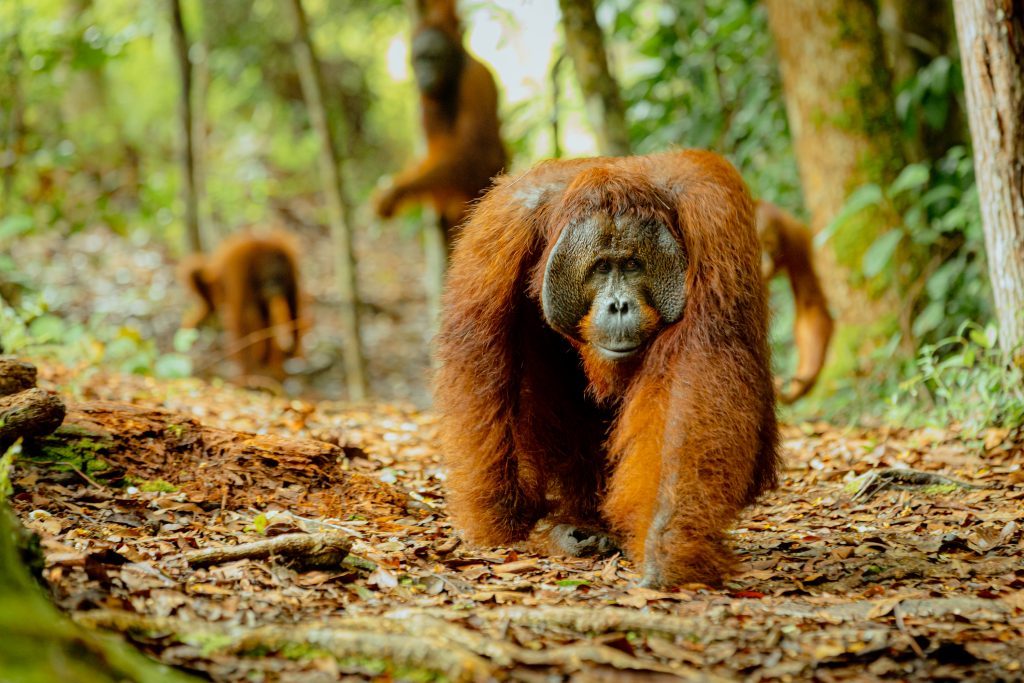 This freely roaming male orangutan may seem dangerous at first sight but the reality is he is just very excited about meeting his fellow rangers who are carrying a backpack full of fresh bananas Thanks to the tireless and dedicated work of Tanjung Puting National Park staff this orangutan as well as many others are thriving in their natural habitat br br Tanjung Puting National Park Central Kalimantan Indonesia