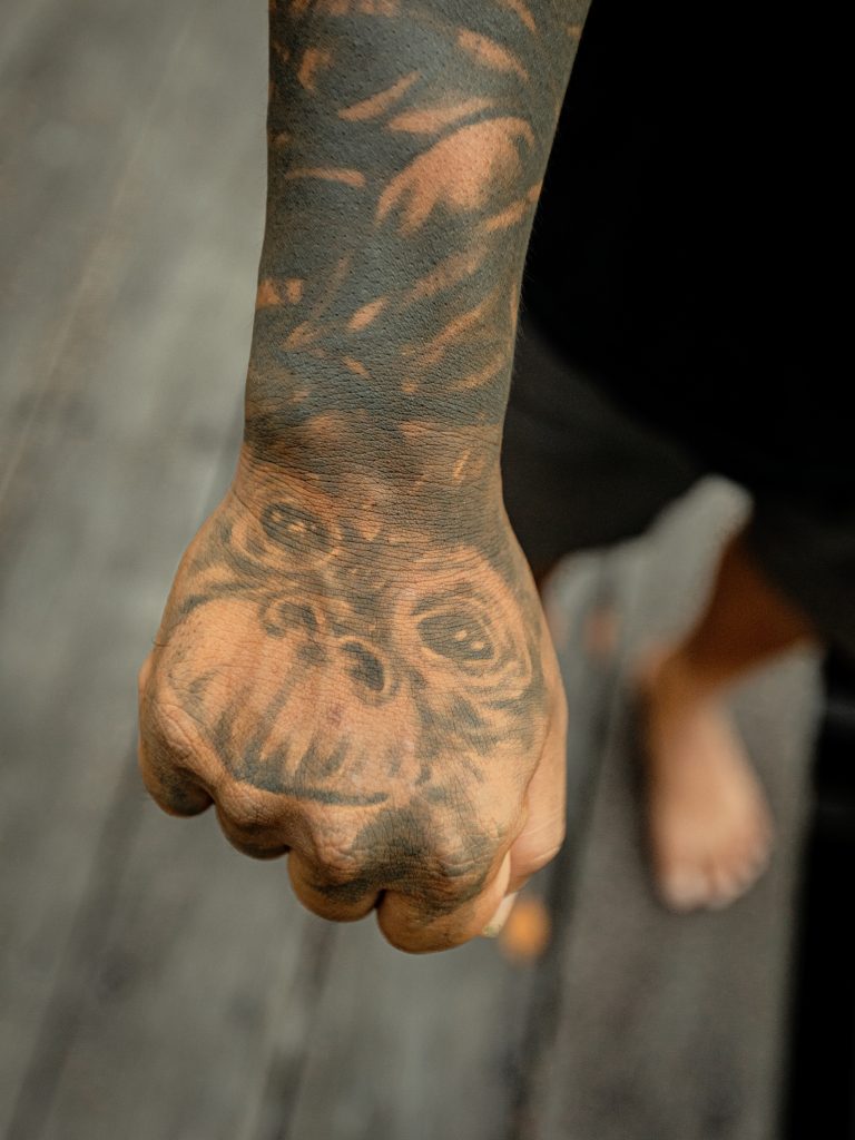 An orangutan tattoo adorns the hand of a park guide For some rangers their commitment to these primates is not only a vocation but also a personal expression literally embroidered on their body br br Tanjung Puting National Park Central Kalimantan Indonesia