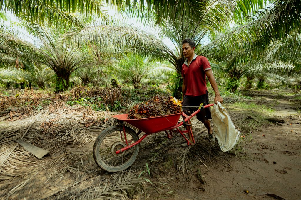 A worker at a palm oil plantation gathers freshly cut palm fruits On average harvesters collect 8 10 carts of fruit each day each cart weighing about 80 100 kilograms For this physically demanding work the typical monthly wage ranges between USD 300 and 400 br br Central Kalimantan Indonesia