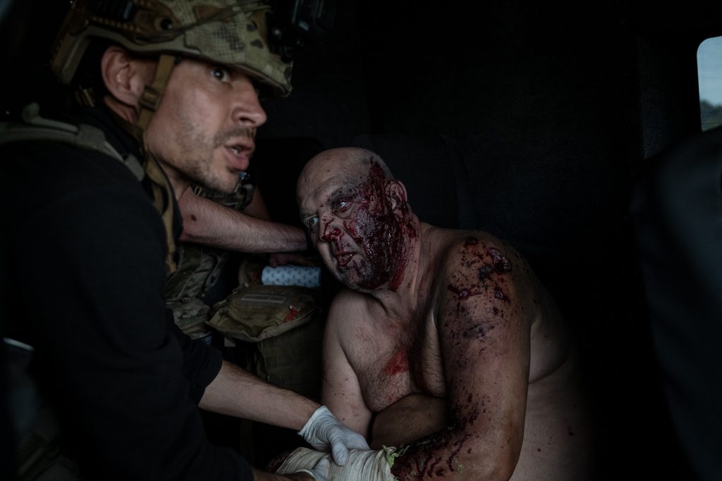 Andriy Khryshtopa an injured civilian was assisted by policemen of the White Angels evacuation team after a Russian FPV drone struck his car while he was driving in the village of Kurakhivka Ukraine on Thursday September 26 2024 The policemen provided first aid as he was transported to a stabilization point