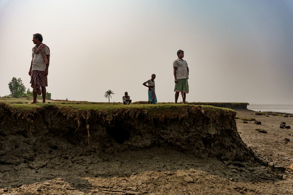 Fishermen stand on the eroded coast of Sagar island which is expected to completely disappear by 2050
