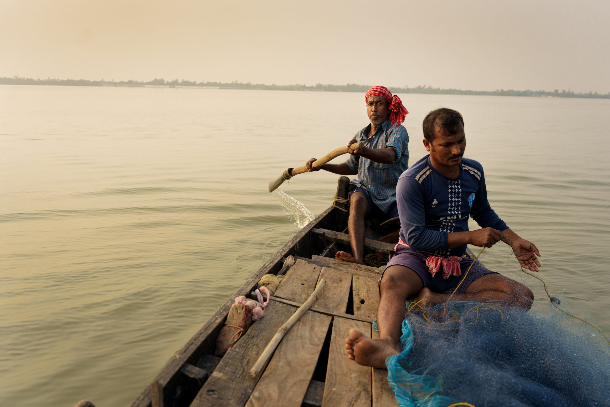 Osoni Mondal and Surojit Mondal go out fishing on a dinghi a small traditional wooden boat off the coast of Bally Island Because of the decline in fish stock cause by climate change fishermen have to dig deeper and deeper in the forest risking dangerous encounters with the local wildlife in particular the famous Bengali Tiger
