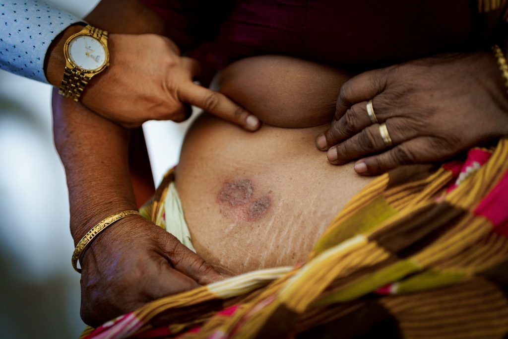 Shuktara Das shows an eczema on her skin during a visit from a volunteering doctor caused by her spending most of her days submerged in brackish water Government and institutions are almost absent from the region so people have to rely on Ngos for healthcare and education