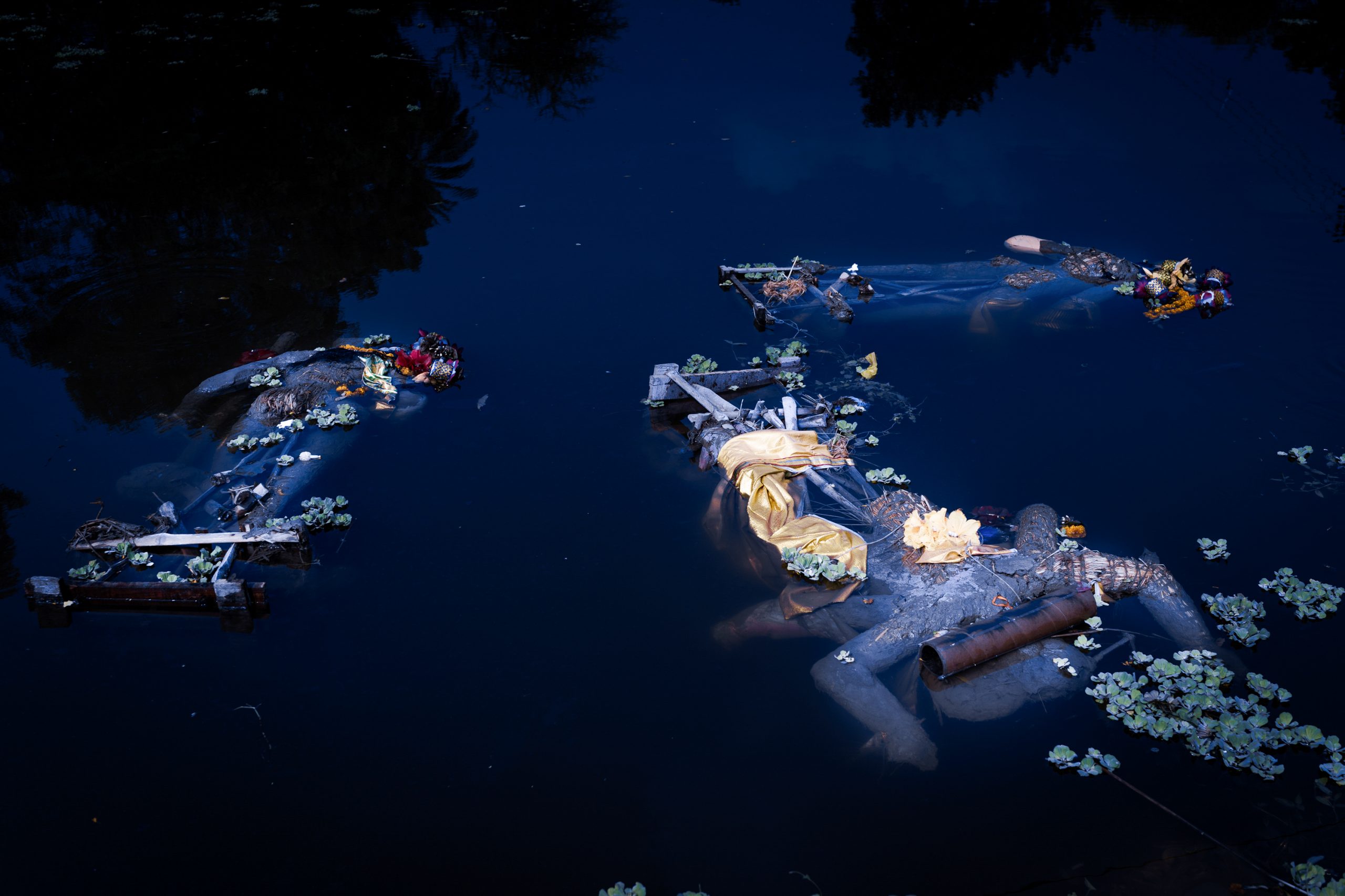 Idols used during Durga Puja are seen in the rising waters of the Sundarbans