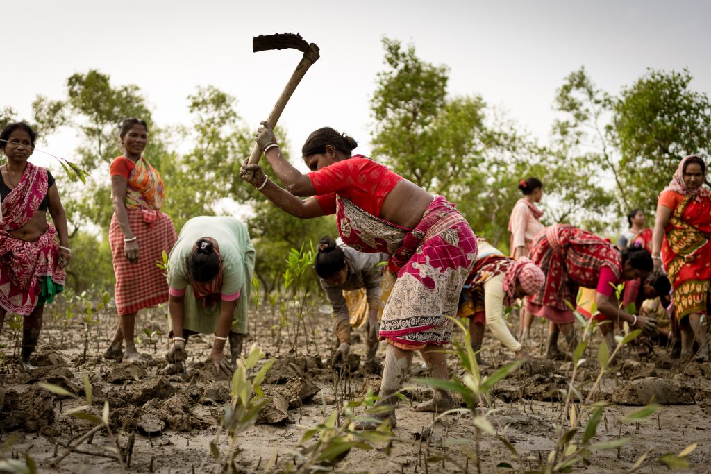 Women plant mangrove saplings in Jharkali island Mangroves are a fundamental part of the ecosytem contrasting the coastal erosion caused by rising sea levels and acting as a barrier against the increasingly violent monsoons