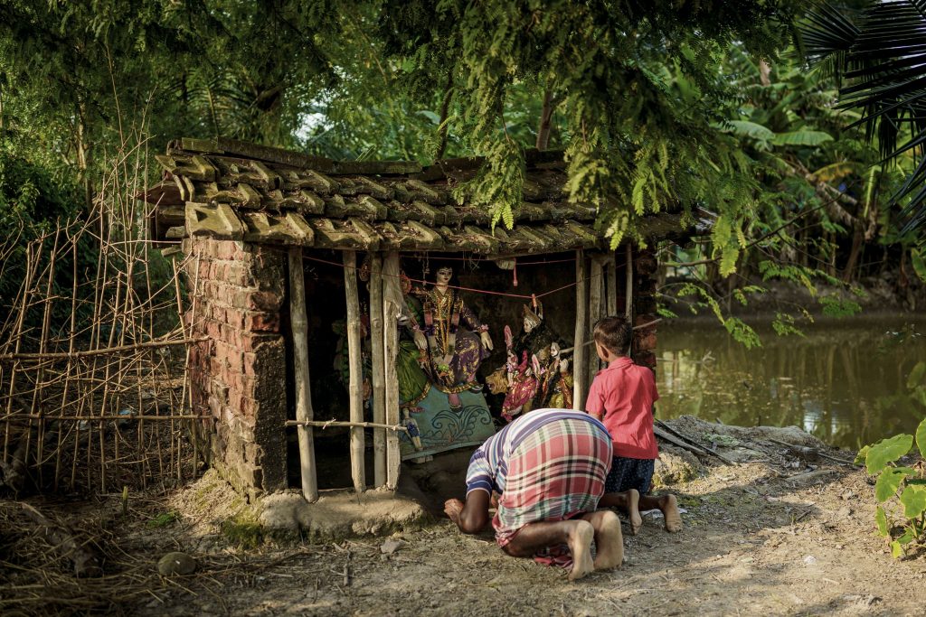 Osoni Mondal a local fisherman prays to the deity of the forest Bonbibi for protection before going on a fishing trip in the deep forest
